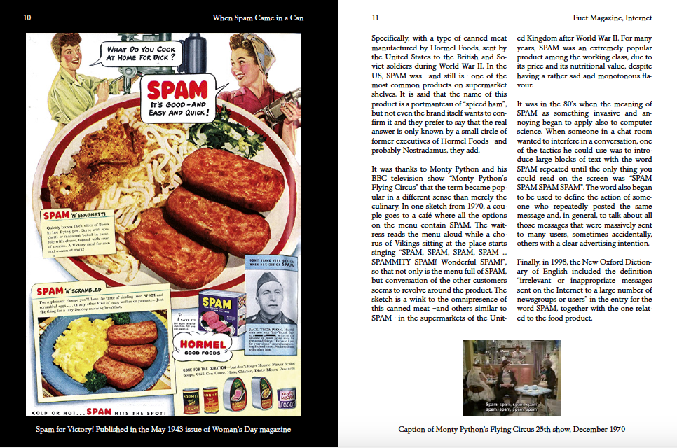 * When SPAM came in a can, FUET Magazine #4 — Internet (texto sobre el origen de la palabra “spam”).