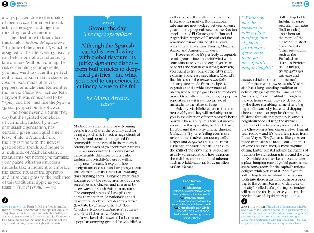 * Savour the day. The city’s specialities, artículo sobre gastronomía madrileña para Monocle Travel Guide: Madrid.